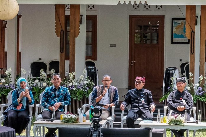 Menparekraf Sandiaga saat berdiskusi dengan 150 pelaku parekraf Banyuwangi, Kamis (29/12/2022) di Pendopo Sabha Swagata Blambangan, Banyuwangi, mengatakan, target capaian sektor pariwisata dan ekonomi kreatif nasional tahun 2023 meningkat dari target di tahun 2022. Salah satunya adalah pergerakan wisatawan nusantara yang mencapai 1,2 miliar-1,4 miliar pergerakan.