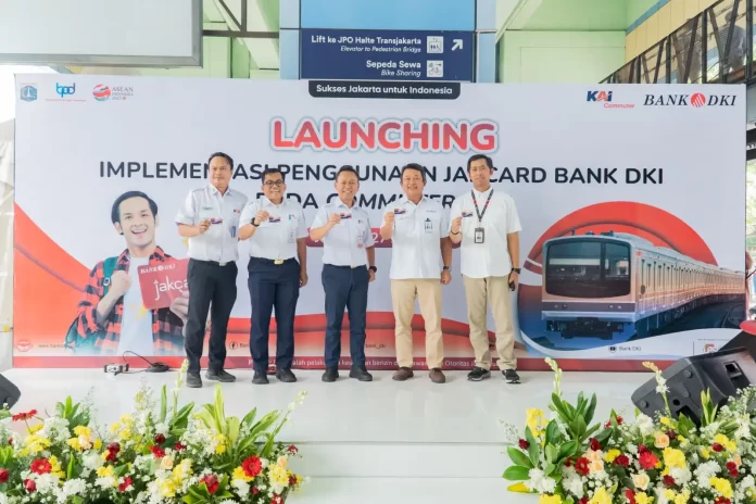 InfoEkonomi.ID – Direktur Teknologi dan Operasional Bank DKI, Amirul Wicaksono bersama Direktur Operasi dan Pemasaran PT Kereta Commuter Indonesia, Broer Rizal, Commercial Vice President PT Kereta Commuter Indonesia, Teguh Triyono, Kepala Stasiun Juanda, Zulfaroki, dan Pemimpin Grup Bisnis Digital Bank DKI, Fajar Kusuma Nugraha melakukan sesi foto bersama usai acara “Launching Implementasi Penggunaan JakCard pada Kereta Commuter Line” di Stasiun KAI Commuter Juanda, Jakarta pada Rabu (27/7).