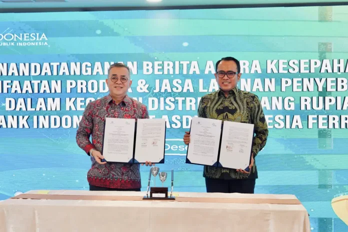 Penandatanganan Berita Acara Kesepahaman Pemanfaatan Produk dan Jasa Layanan Penyeberangan dalam kegiatan Distribusi Uang Rupiah antara Bank Indonesia dan ASDP berlangsung di Auditorium Kantor Pusat ASDP, Rabu (11/12) pagi, yang dihadiri oleh Direktur Utama ASDP Heru Widodo dan Kepala Departemen Pengelolaan Uang Bank Indonesia Marlison Hakim.