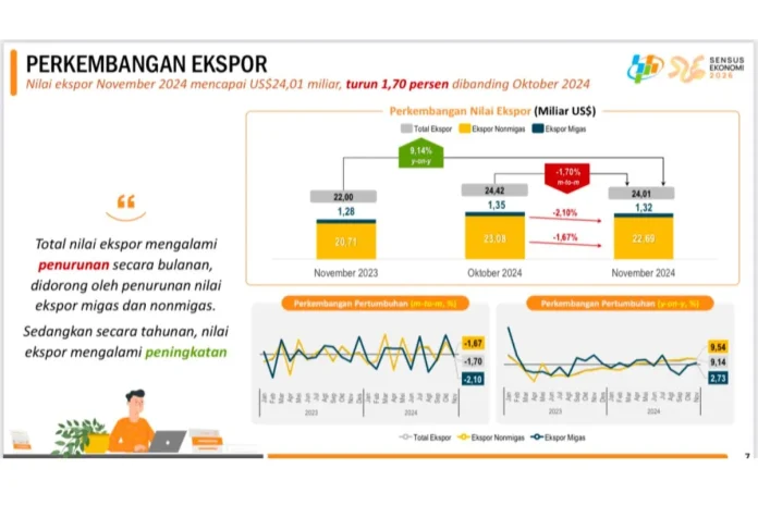Badan Pusat Statistik (BPS) melaporkan neraca perdagangan Indonesia pada November 2024 mencatat surplus sebesar 4,42 miliar dolar AS. Angka ini meningkat 1,94 miliar dolar AS dibandingkan bulan sebelumnya dan menjadi surplus terbesar kedua sepanjang tahun 2024.