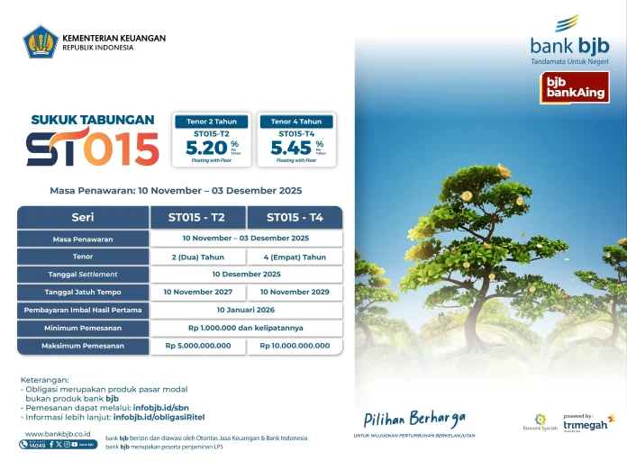 bank bjb kembali menghadirkan kemudahan investasi melalui penawaran Sukuk Tabungan seri ST015. Produk investasi yang diterbitkan pemerintah ini menjadi pilihan menarik bagi masyarakat yang ingin berinvestasi mudah, terjangkau, dan berdampak langsung bagi pembangunan negara. Masa penawaran ST015 telah dimulai sejak 10 November 2025 dan akan berlangsung hingga 3 Desember 2025, sehingga masyarakat memiliki cukup waktu untuk menentukan keputusan investasi terbaik.