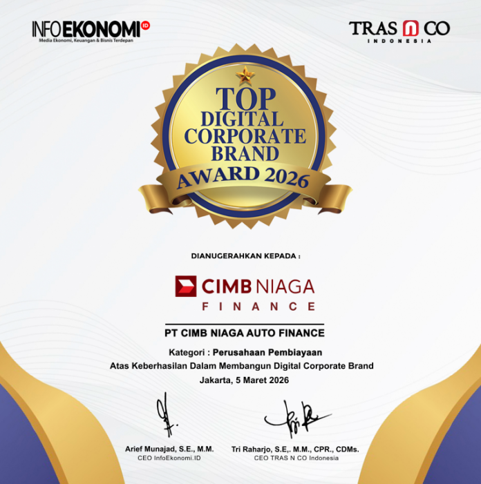 “Selamat kepada PT CIMB Niaga Auto Finance yang berhasil meraih penghargaan 8th Top Digital Corporate Brand Award 2026 kategori Pembiayaan. Penghargaan ini merupakan bentuk apresiasi atas keberhasilan perusahaan dalam membangun corporate brand yang kuat di ranah digital serta menjaga konsistensi komunikasi dan reputasi perusahaan di tengah persaingan industri yang semakin kompetitif,” ujar Arief.
