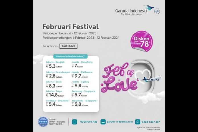 InfoEkonomi.ID – Maskapai penerbangan nasional Garuda Indonesia kembali menghadirkan penawaran diskon tiket bertajuk “Februari Festival” yang digelar dari tanggal 6 hingga 12 Februari 2023. Penawaran menarik tersebut berupa potongan harga tiket hingga 78 persen untuk berbagai destinasi unggulan baik domestik maupun internasional periode penerbangan hingga 12 Februari 2024.