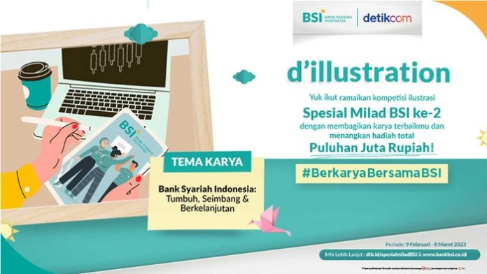 Selain itu, agar masyarakat juga merasakan pengalaman dengan Bank Syariah, BSI bersama Detikcom menggelar ‘D’Ilustration Special Milad BSI’. Kompetisi menggambar ilustrasi ini mengangkat tema ‘Tumbuh, Seimbang dan Berkelanjutan’.
