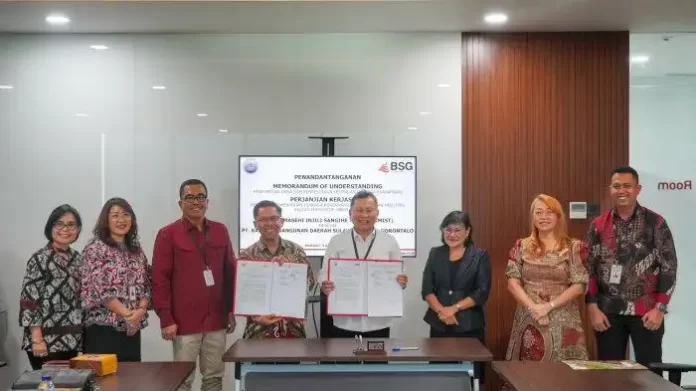 Direktur Utama BSG, Revino Pepah dan Ketua Umum GMIST, Pdt Welman Boba, menandatangani MoU antara BSG dan GMIST di Awu Meeting Room Kantor Pusat BSG, Manado, Sulawesi Utara, Rabu (9/8/2023).