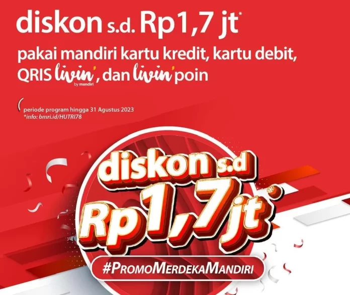 InfoEkonomi.ID – Dalam rangka memperingati HUT ke 78 RI, Bank Mandiri menawarkan sejumlah promo menarik untuk para nasabahnya. Promo diskon sampai dengan Rp1,7 juta ini berlaku untuk pembayaran menggunakan kartu kredit, kartu debit, QRIS Livin, hingga Livin Poin.