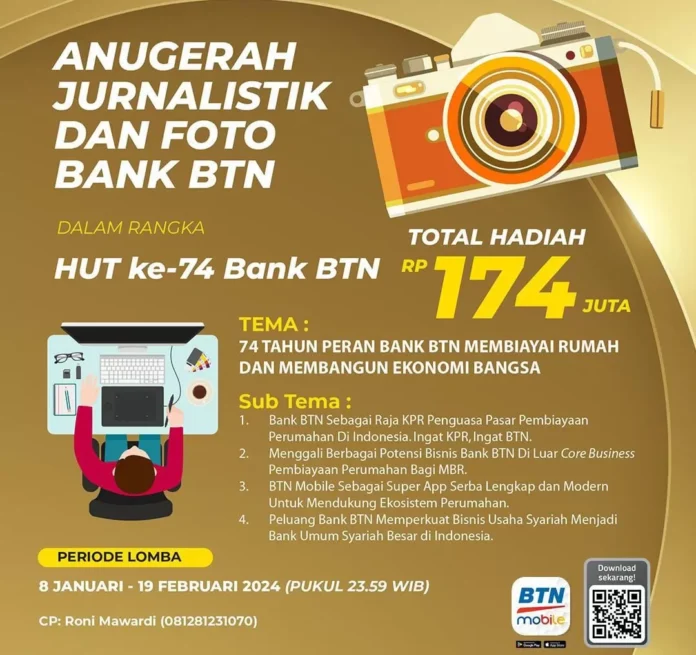 InfoEkonomi.ID – Dalam rangka memperingati Hari Ulang Tahun ke-74, PT Bank Tabungan Negara (BTN) Tbk menggelar lomba jurnalistik dan foto berhadiah total ratusan juta.