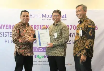 Sertifikat ISO 37001:2016 diterima langsung oleh Direktur Utama Bank Muamalat Indra Falatehan dari President Director PT TÜV SÜD Indonesia Yuan Handayana pada Kamis, 25 Januari 2024 di Jakarta. TUV SUD Indonesia merupakan badan sertifikasi internasional yang telah terakreditasi oleh Komite Akreditasi Nasional (KAN).
