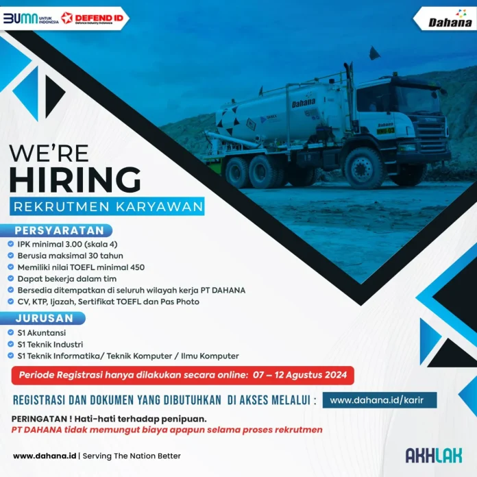 Pada tahun ini, DAHANA membuka kesempatan bagi putra-putri terbaik bangsa untuk bergabung dan berkarir bersama sebagai karyawan Management Trainee. DAHANA mencari individu yang berdedikasi, berkompeten, dan siap menghadapi tantangan di berbagai wilayah kerja PT DAHANA. Berikut persyaratannya.