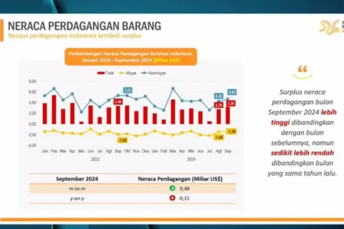 Indonesia kembali mengalami surplus neraca perdagangan sebesar US$3,26 miliar pada September 2024. Plt. Kepala Badan Pusat Statistik (BPS), Amalia Adininggar Widyasanti, menyatakan, “Dengan demikian, neraca perdagangan Indonesia telah mencatat surplus selama 53 bulan berturut-turut sejak Mei 2020,” dalam pengantar Rilis Berita Statistik, Selasa (15/10).