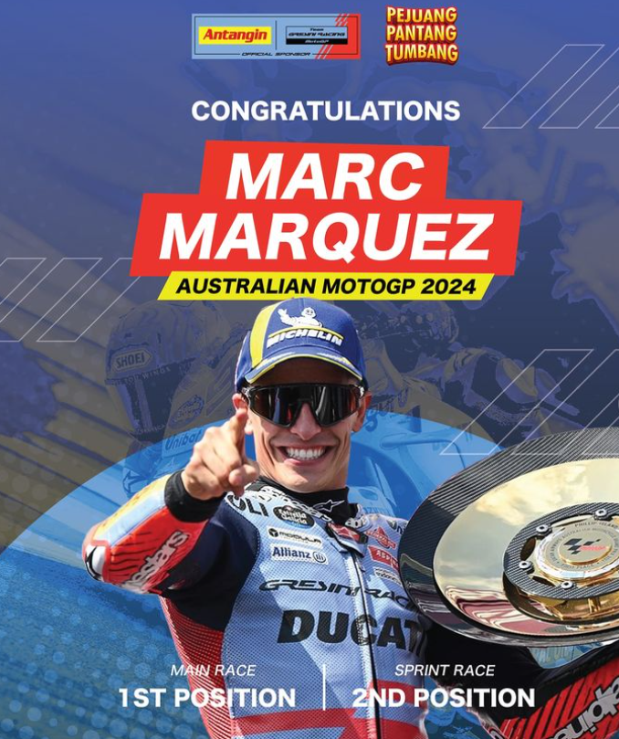 MotoGP Australia 2024 di sirkuit Philip Island berakhir dengan kemenangan spektakuler Marc Marquez. Pembalap tim Gresini ini, yang didukung oleh berbagai sponsor Indonesia seperti Antangin, berhasil meraih podium teratas. Pertarungan sengit terjadi antara Marquez dan Jorge Martin, yang harus puas berada di posisi kedua, sementara Pecco Bagnaia finis ketiga dengan selisih waktu 8 detik.
