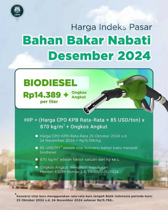 Kementerian Energi dan Sumber Daya Mineral (ESDM) melalui Direktorat Jenderal Energi Baru, Terbarukan dan Konservasi Energi (Ditjen EBTKE) menetapkan Harga Indeks Pasar (HIP) Bahan Bakar Nabati (BBN) jenis Biodiesel untuk Bulan Desember 2024 sebesar Rp14.389 per liter ditambah ongkos angkut.