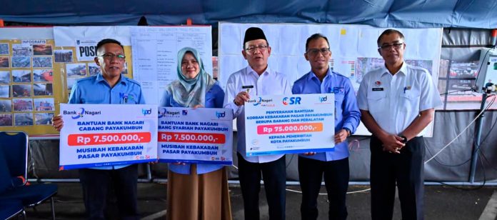 Sebagai bentuk kepedulian terhadap masyarakat yang terdampak musibah, Bank Nagari menyalurkan bantuan bagi para pedagang korban kebakaran di pusat pertokoan Blok Barat Pasar Payakumbuh pada Rabu (3/9).